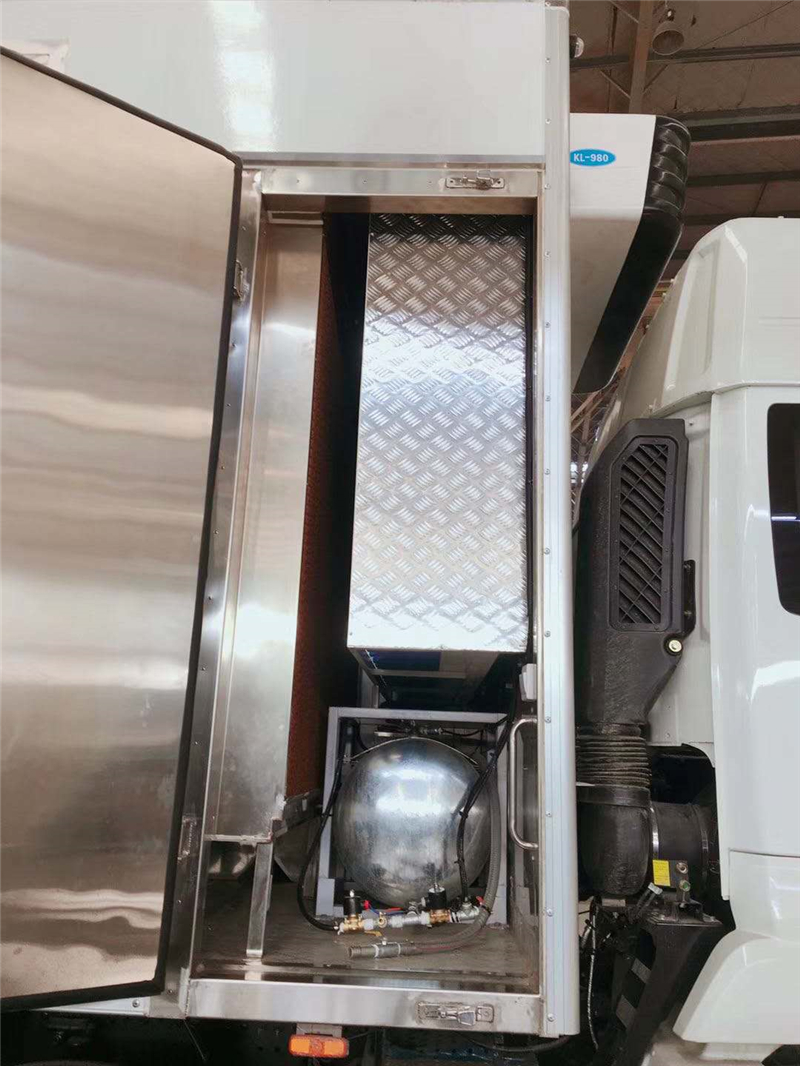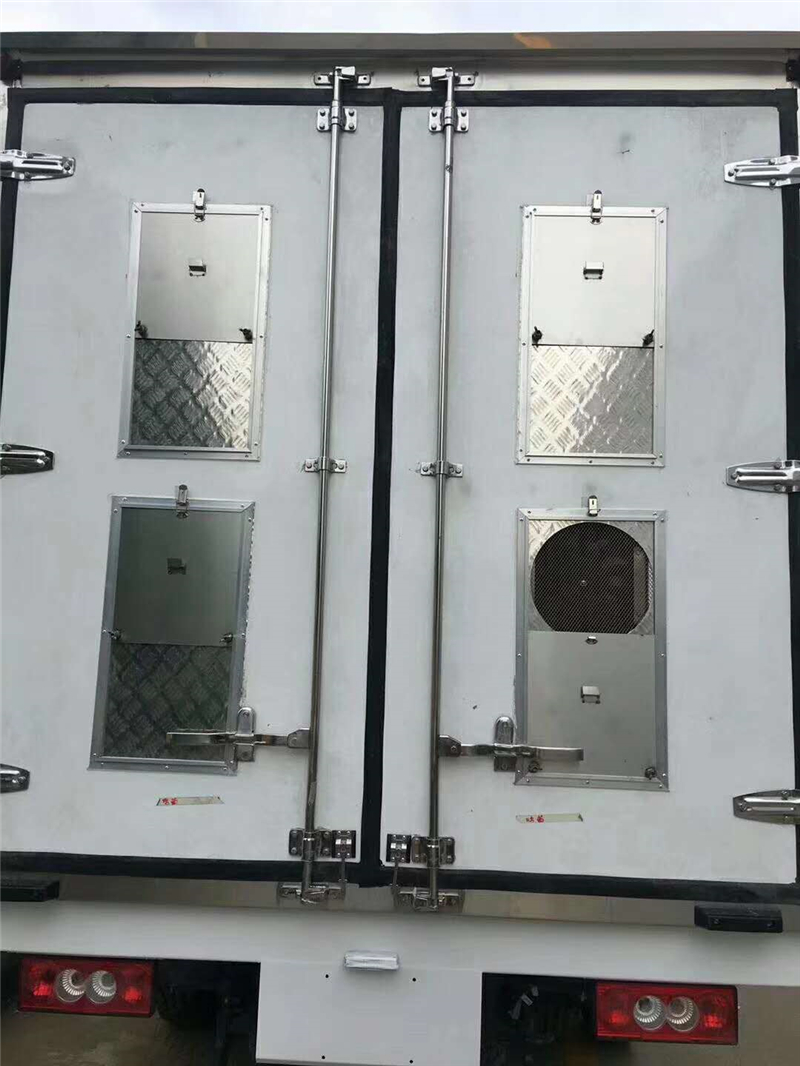 【豬苗車】上裝配置外玻璃鋼,內(nèi)不銹鋼,兩層液壓升降層板,尾部液壓翻轉(zhuǎn)上豬平臺(tái),層板為不銹鋼骨架鋪鋁花紋板。外部電動(dòng)升降窗,排氣扇,柴油發(fā)電機(jī),暖風(fēng)加熱,喂水系統(tǒng),凈水箱、污水箱,箱內(nèi)攝像頭監(jiān)控,倒車影像,凱利制冷機(jī)組。(油暖加熱為選裝部件)