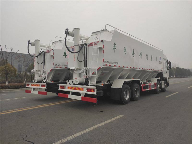 散裝飼料車,又名散裝飼料運輸車,飼料運輸車。結(jié)構簡單、性能可靠、輸送量大、操控方便、機動性強、對物料無污染等特點,廣泛應用于各大中小型養(yǎng)殖企業(yè)的飼料的運輸。散裝飼料車的飼料罐架設在卡車的底盤上,罐頂開有進料口.頂部的一根螺旋輸送卸料管(俗稱卸料絞龍)則可自由回轉(zhuǎn)和抬升,抬升的仰角可達60度。運輸時,頂部的螺旋管平臥在罐頂;卸料時則抬起,使管端的出料口與畜禽飼養(yǎng)場貯料罐頂部的進料門相接,駕駛室內(nèi)裝有操縱裝置(操縱裝置也可裝置在罐體尾部),卸料時通過車底的動力輸出軸和減速器來驅(qū)動螺旋,以完成卸料。