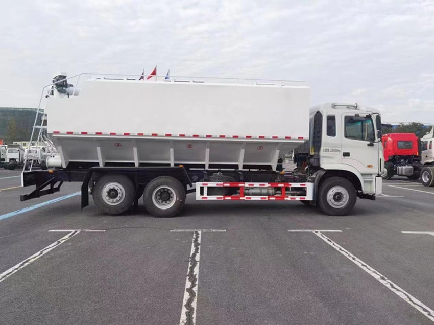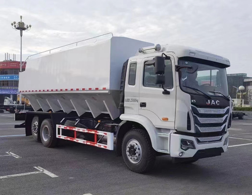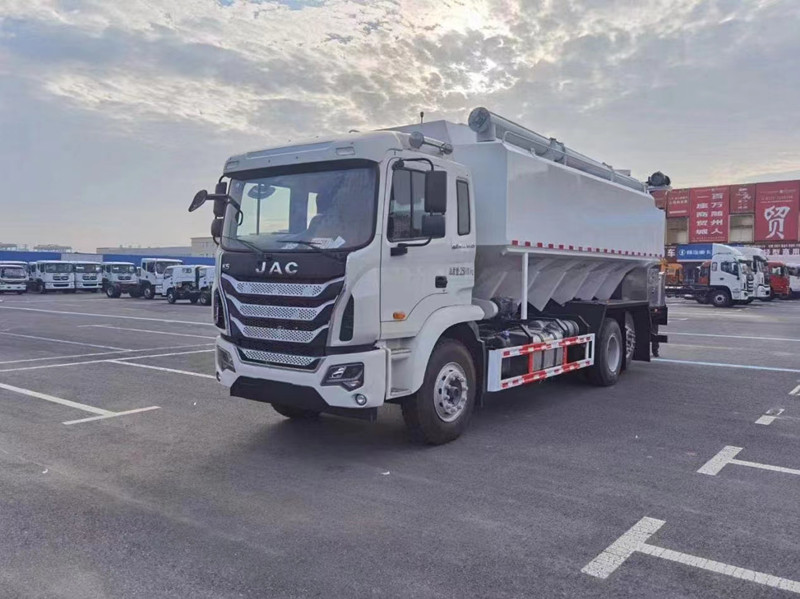 散裝飼料運輸車,散裝飼料車的飼料罐架設(shè)在卡車的底盤上,罐頂開有進(jìn)料口.頂部的一根螺旋輸送卸料管(俗稱卸料絞龍)則可自由回轉(zhuǎn)和抬升,抬升的仰角可達(dá)60度。運輸時,頂部的螺旋管平臥在罐頂;卸料時則抬起,使管端的出料口與畜禽飼養(yǎng)場貯料罐頂部的進(jìn)料門相接,駕駛室內(nèi)裝有操縱裝置(操縱裝置也可裝置在罐體尾部),卸料時通過車底的動力輸出軸和減速器來驅(qū)動螺旋,以完成卸料。