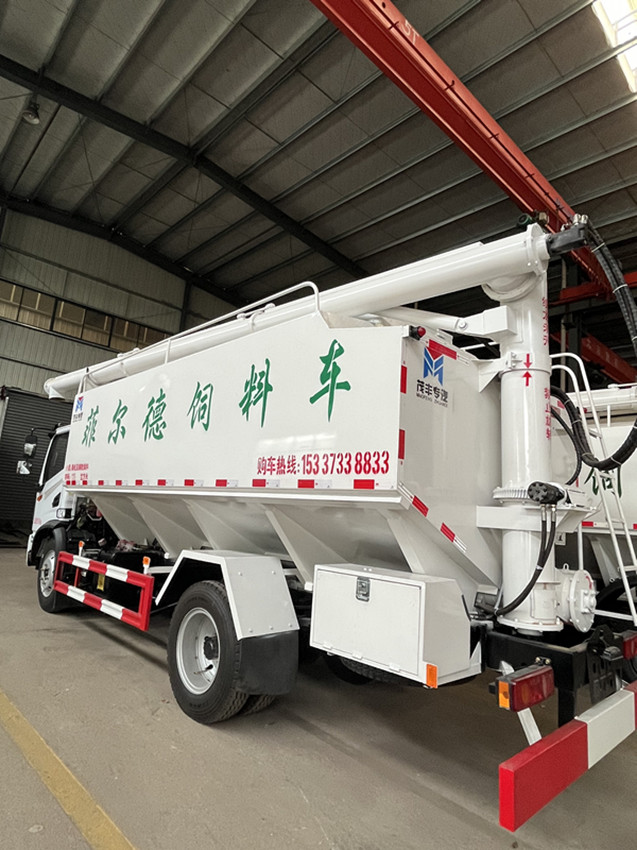 散裝飼料運輸車,散裝飼料車的飼料罐架設(shè)在卡車的底盤上,罐頂開有進料口.頂部的一根螺旋輸送卸料管(俗稱卸料絞龍)則可自由回轉(zhuǎn)和抬升,抬升的仰角可達(dá)60度。運輸時,頂部的螺旋管平臥在罐頂;卸料時則抬起,使管端的出料口與畜禽飼養(yǎng)場貯料罐頂部的進料門相接,駕駛室內(nèi)裝有操縱裝置(操縱裝置也可裝置在罐體尾部),卸料時通過車底的動力輸出軸和減速器來驅(qū)動螺旋,以完成卸料。